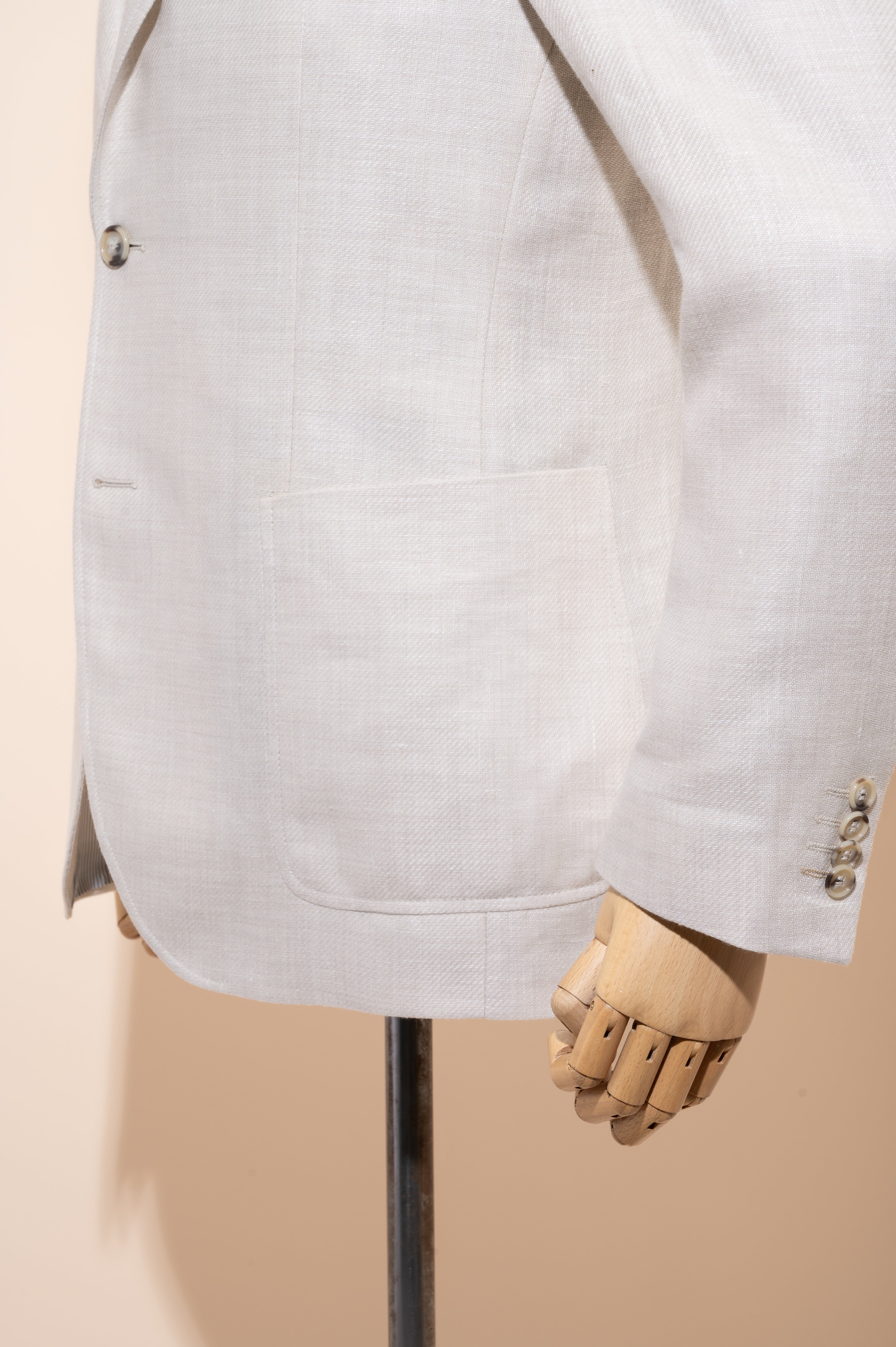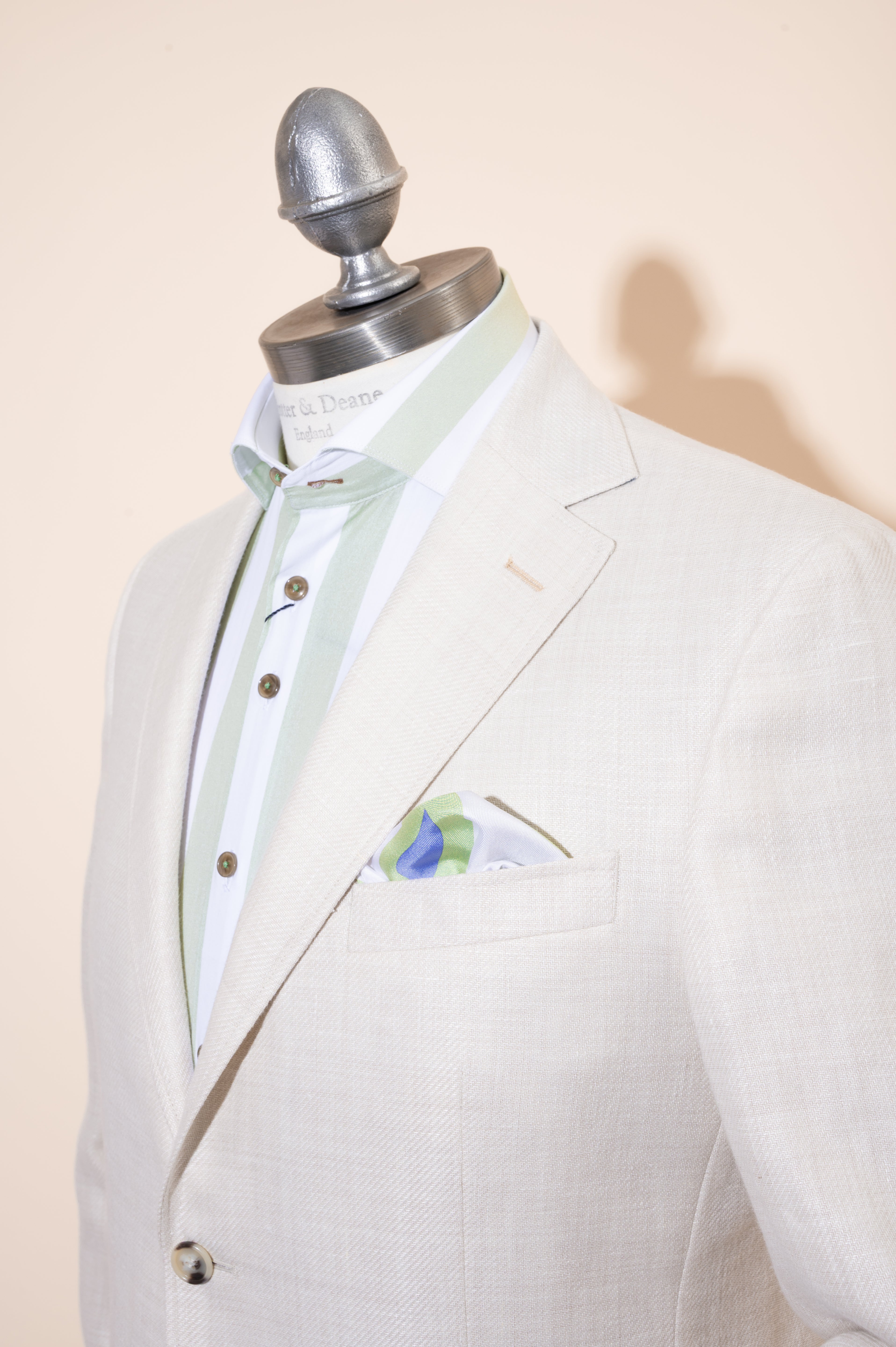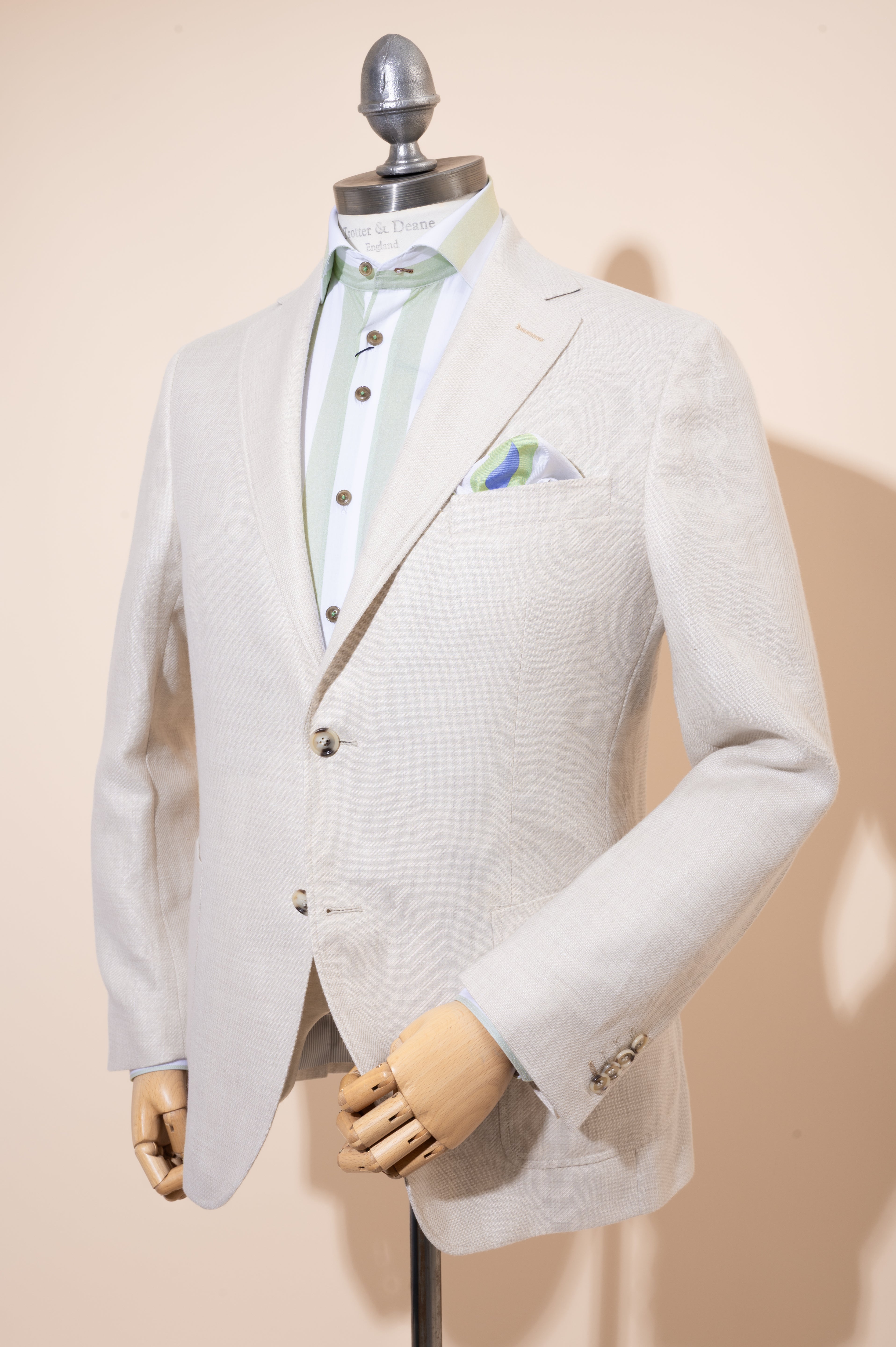 Our summer blend jackets are constructed from wool and linen, this combines the texture and look of linen but with an added sophisticated feel.