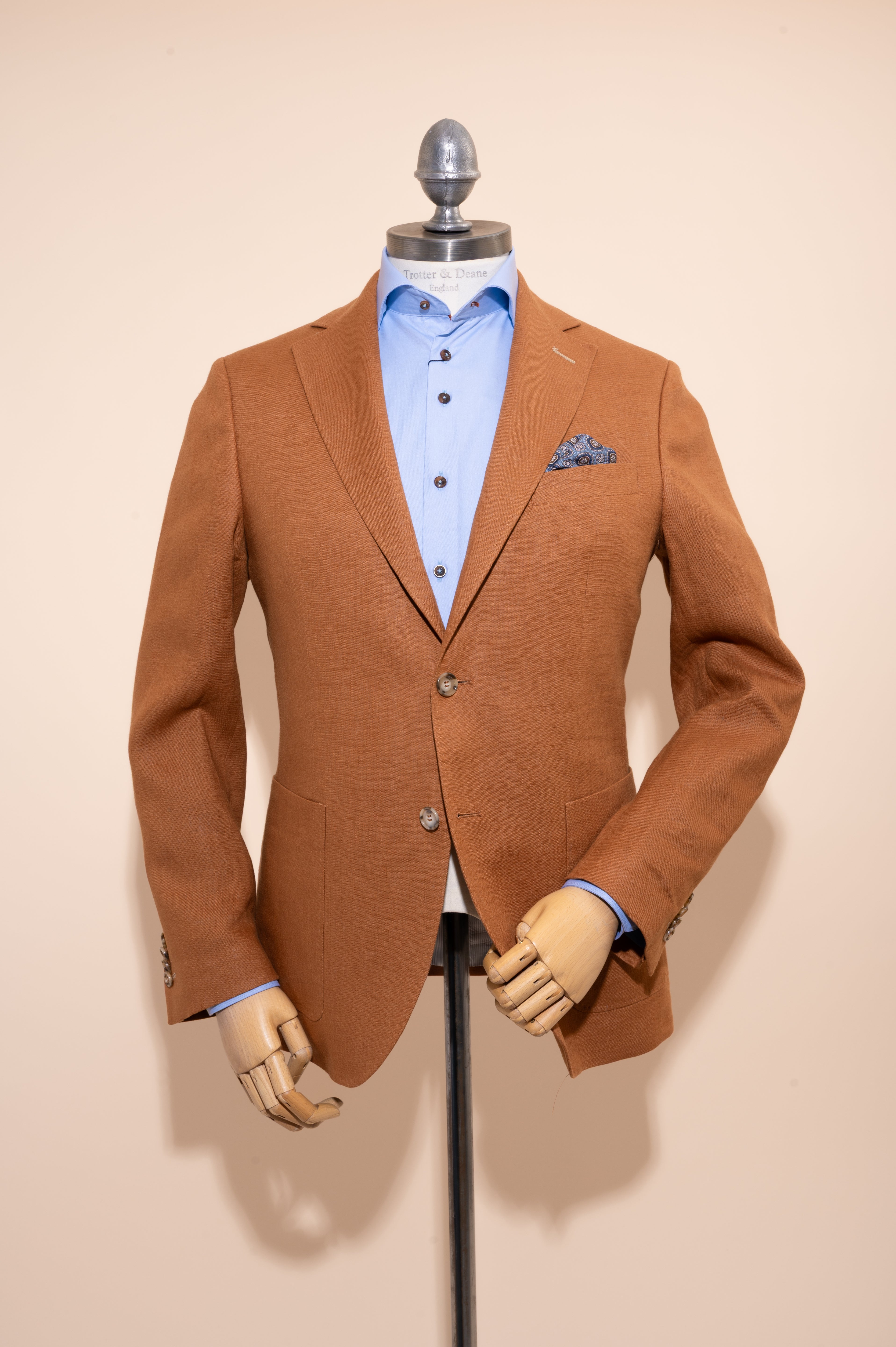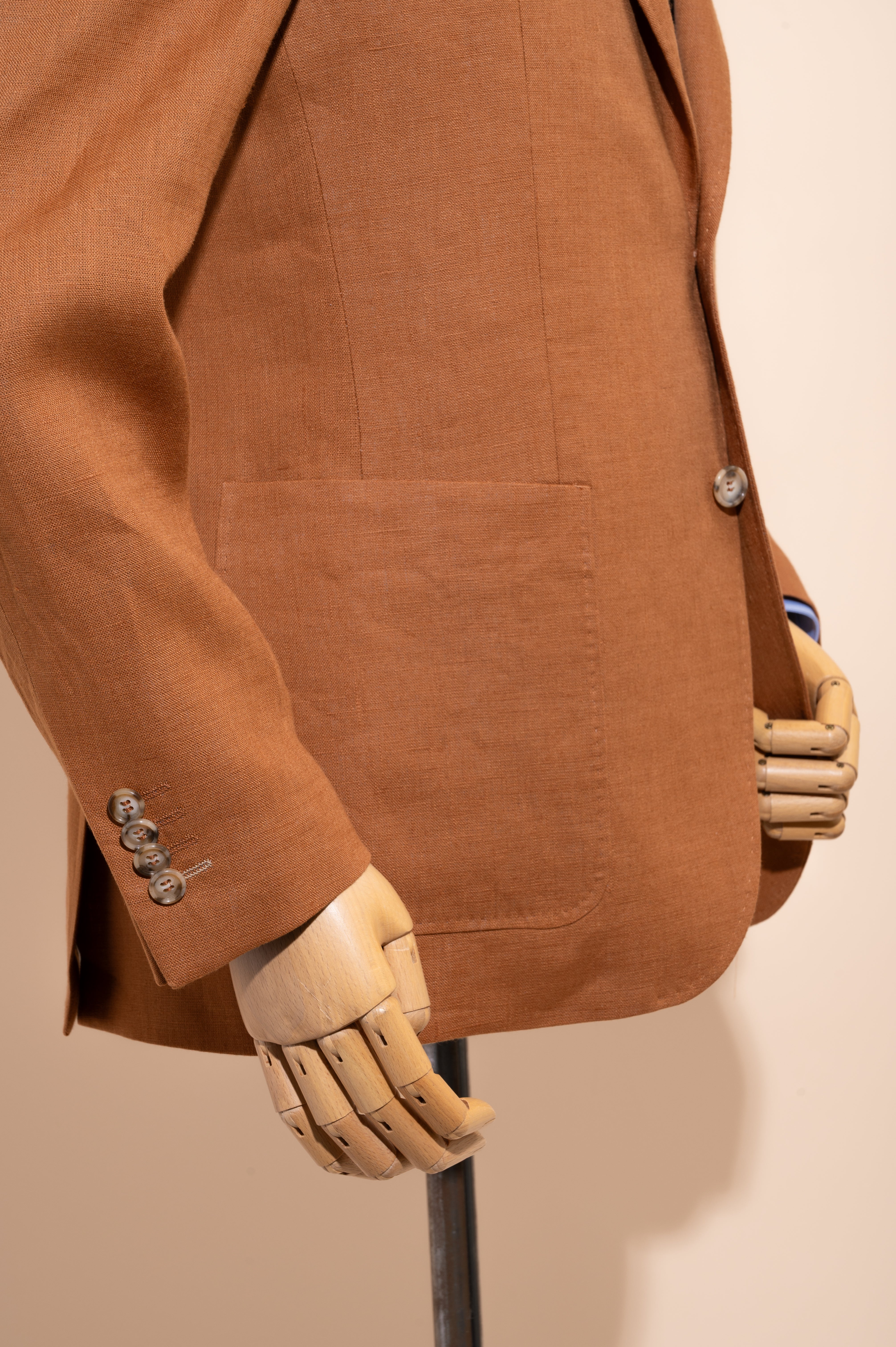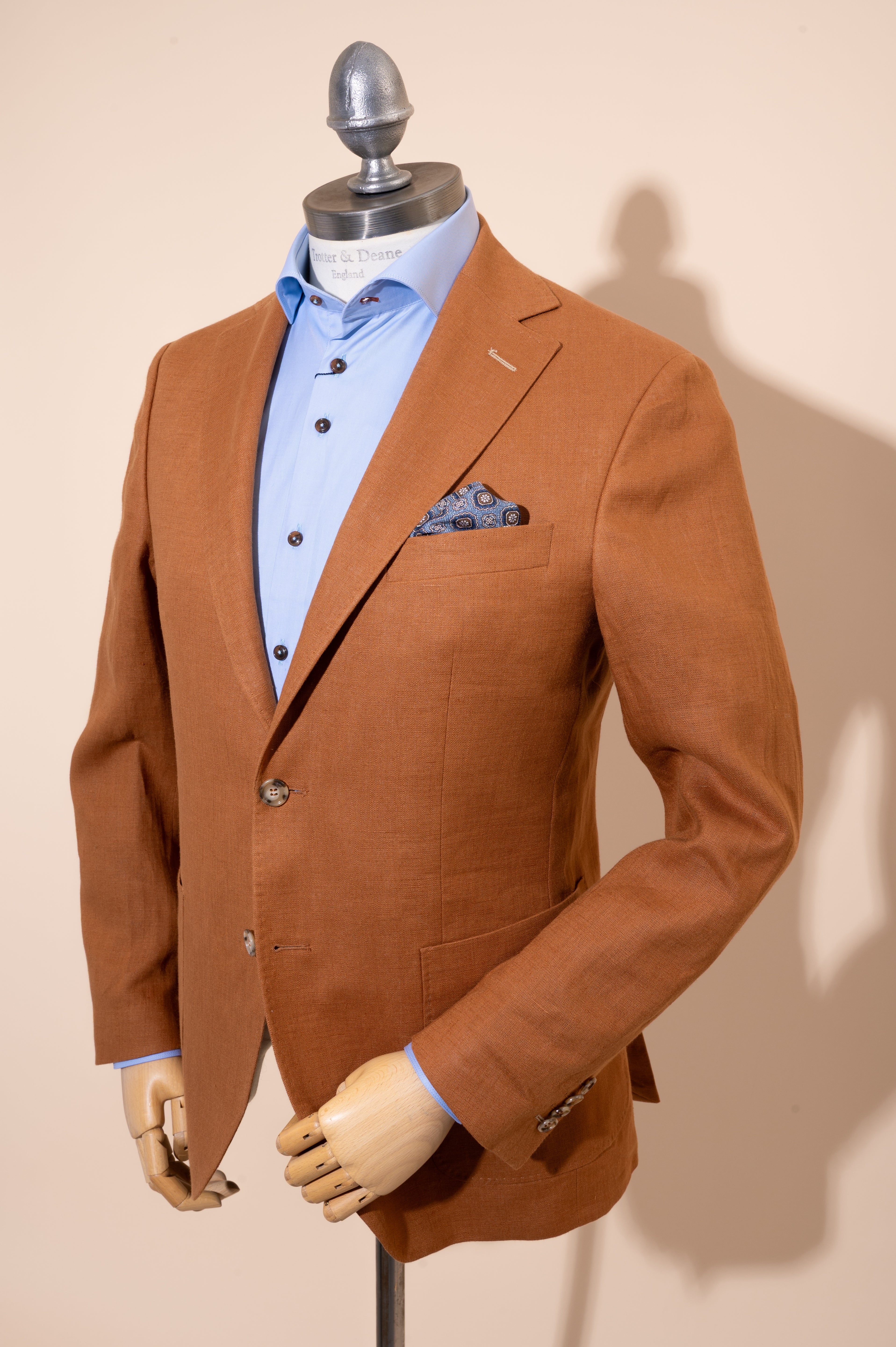 Our pure linen jacket cloths have been washed to soften their look and feel, and to minimise any heavy creasing. These jackets are ideal for relaxed summer settings, offering a balance of formality and comfort.