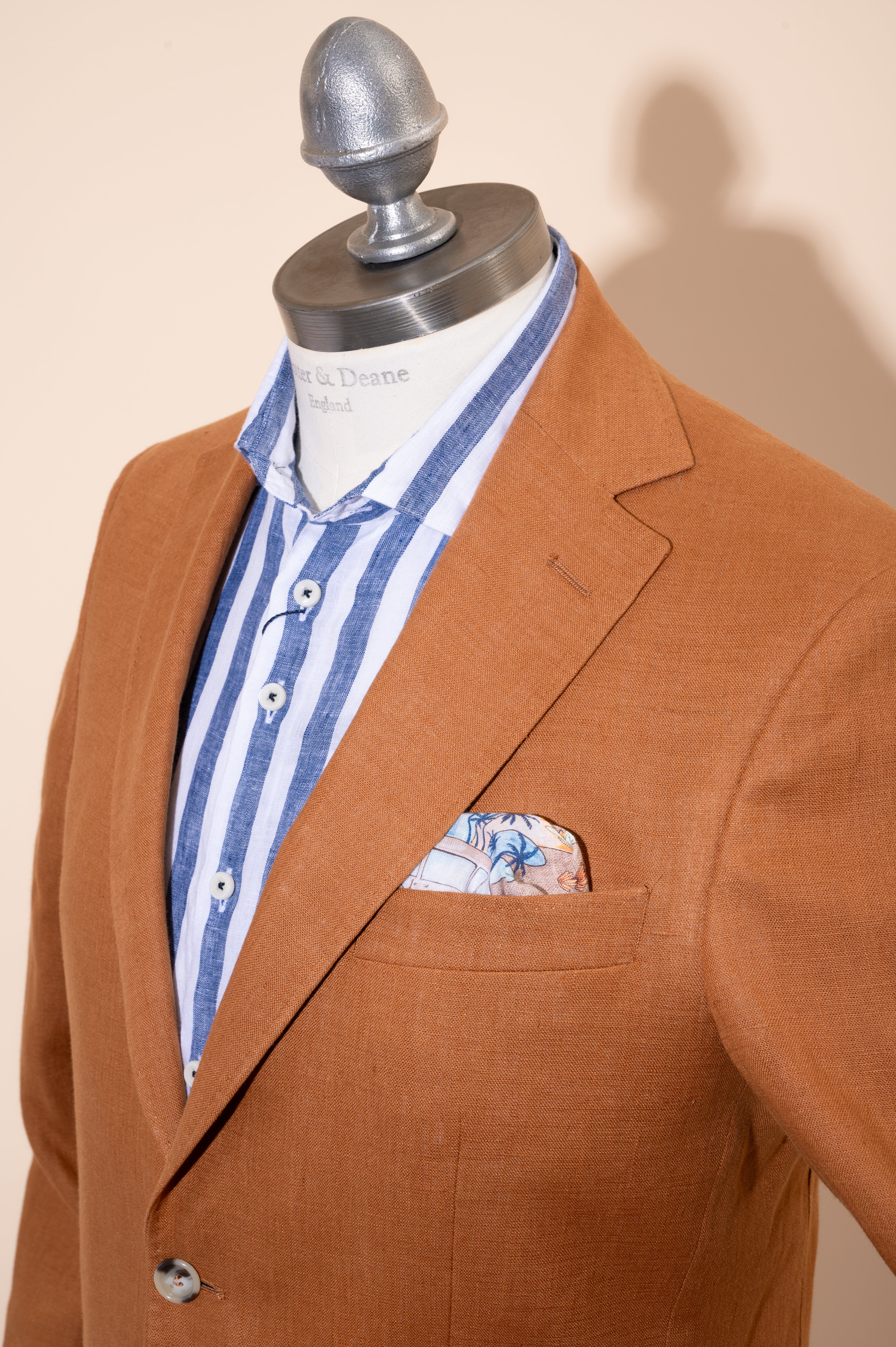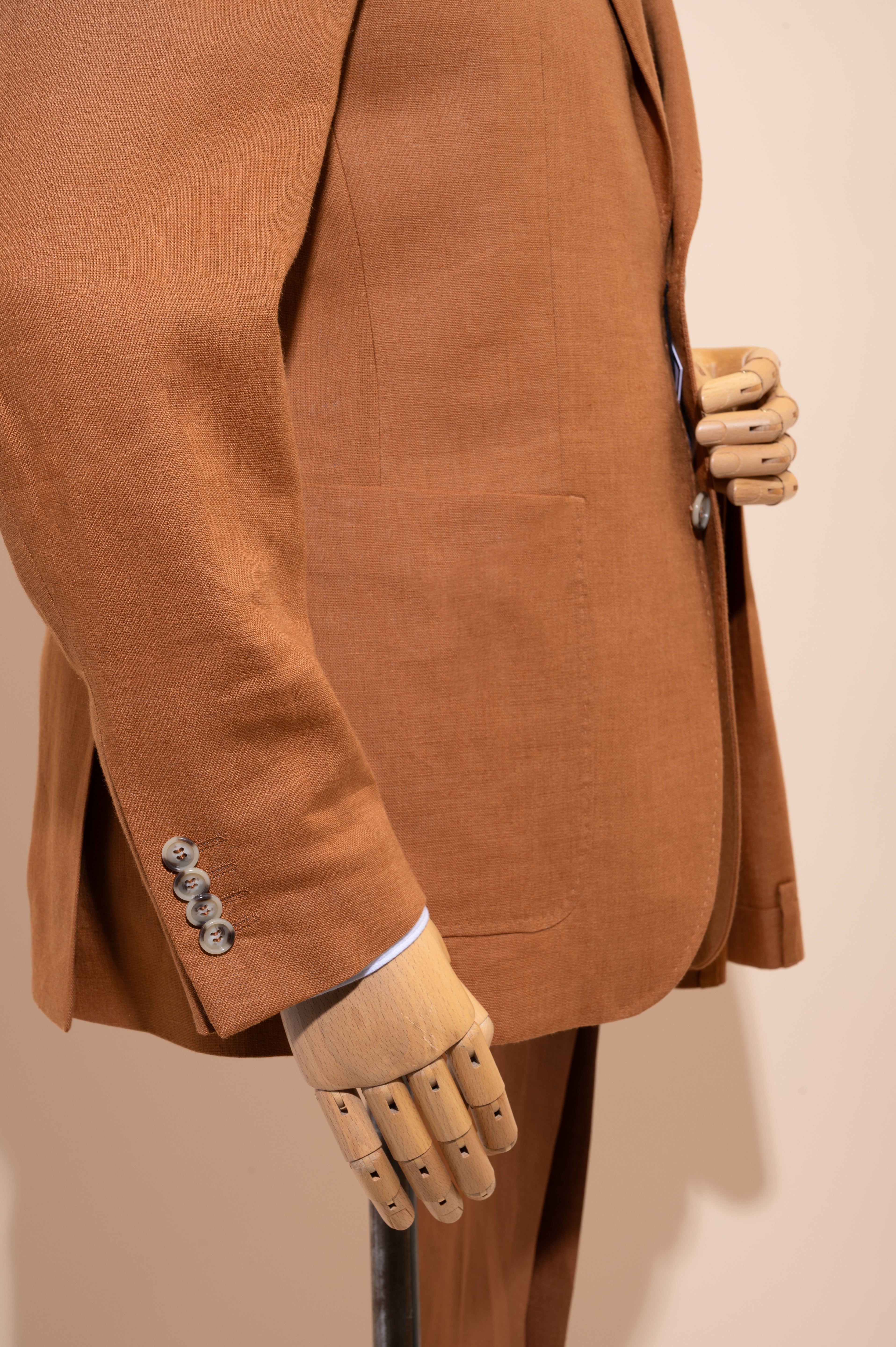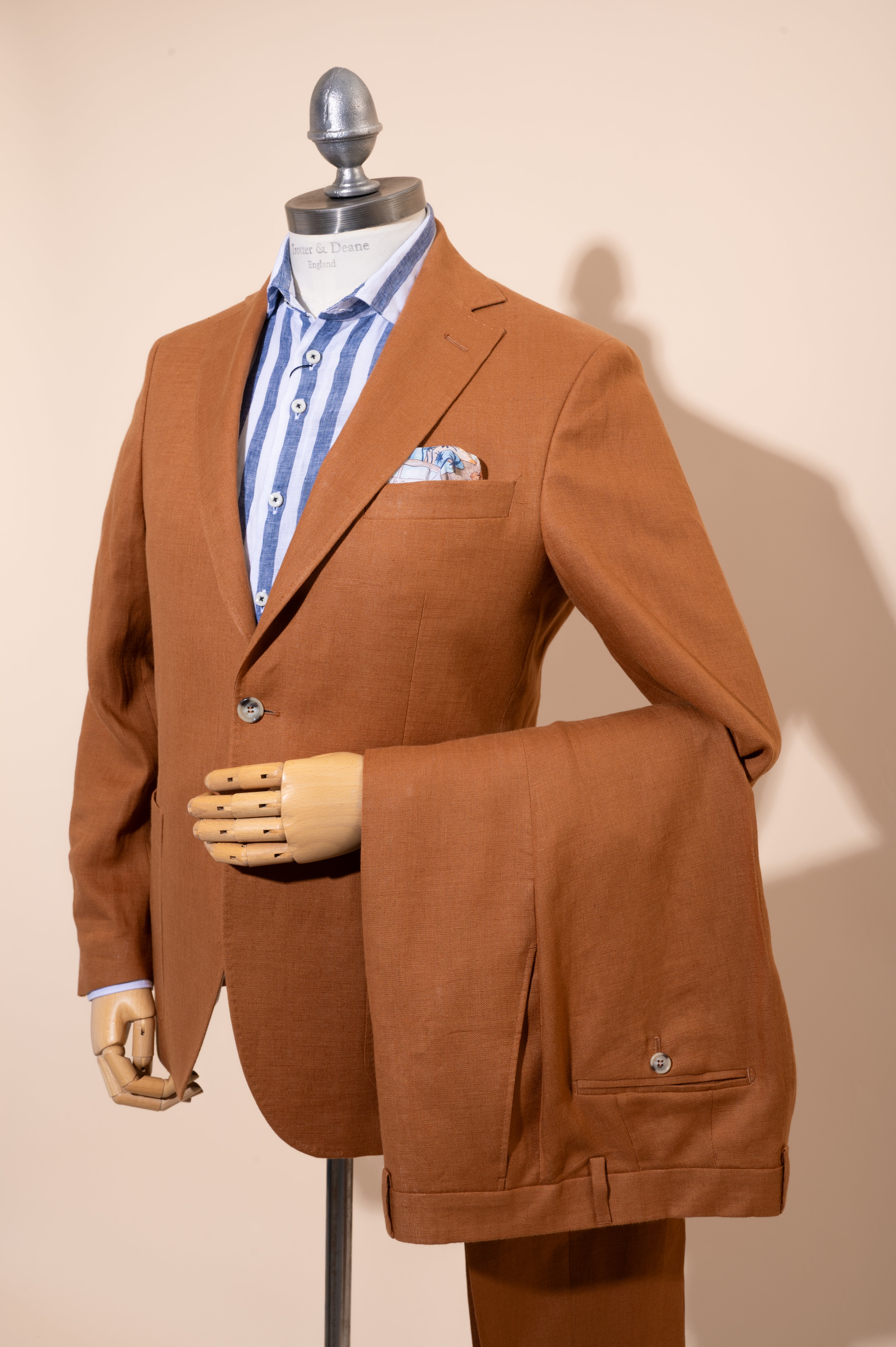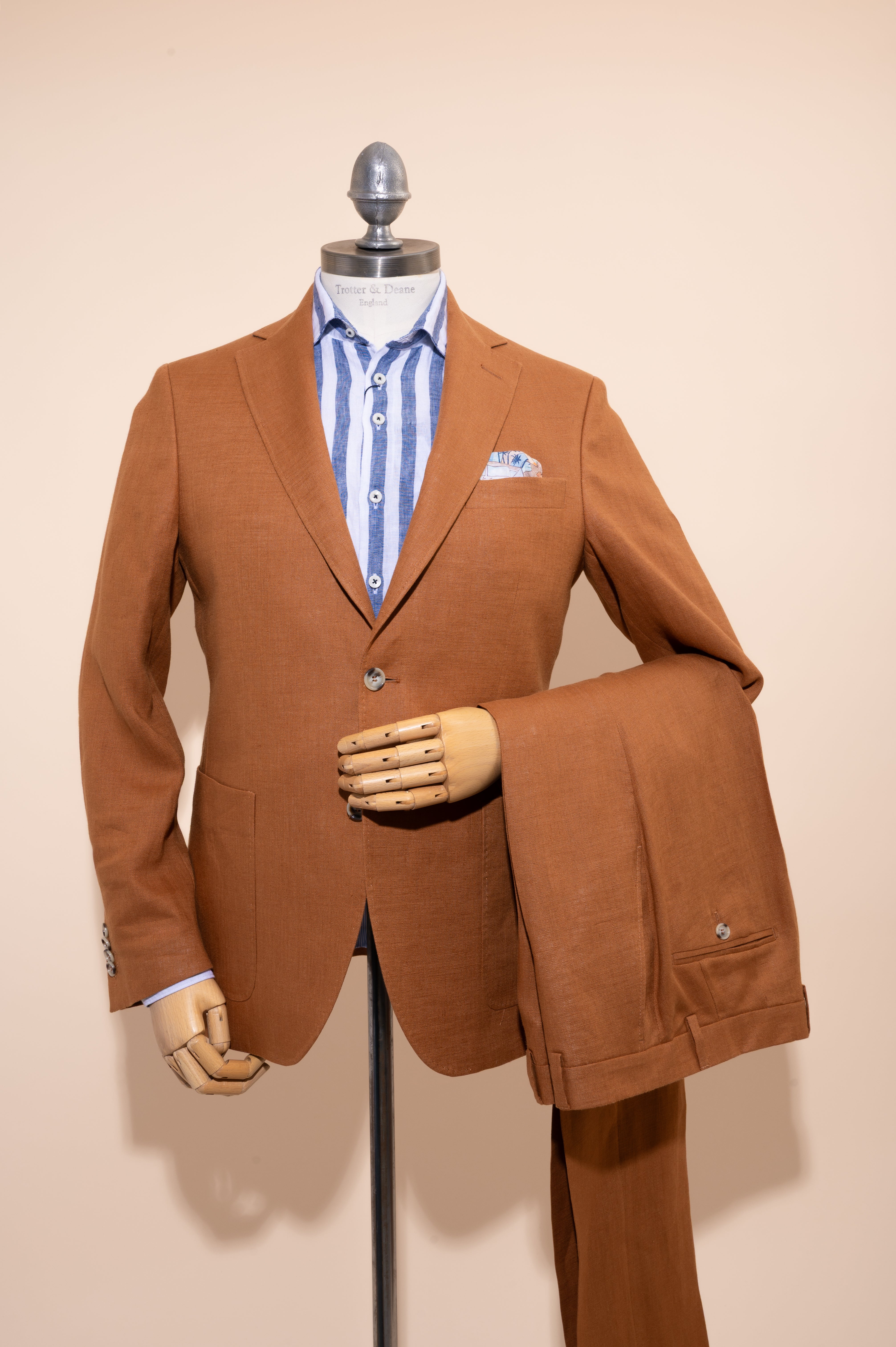 Our pure linen suit cloths have been washed to soften their look and feel, and to minimise any heavy creasing. These suits are ideal for relaxed summer settings, offering a balance of formality and comfort.