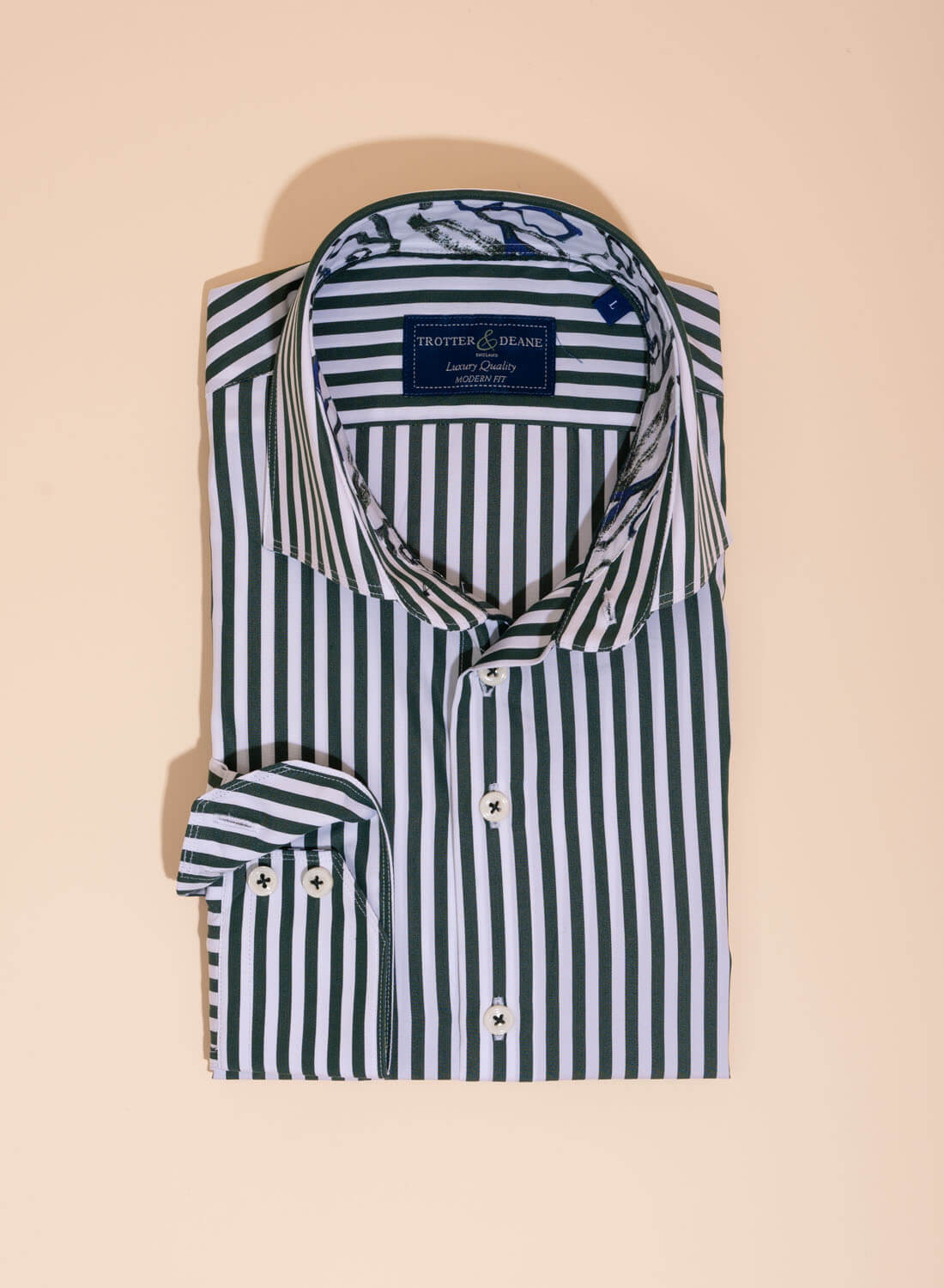 Using only the finest long yard Egyptian cotton, all our shirt fabrics are woven in Italy. Distinct and unique eye-catching trims are a signature of Trotter & Deane and allow our shirts to make a statement when worn open necked. Contrasting stitching and button details draw attention to the quality and add interest to the overall look.