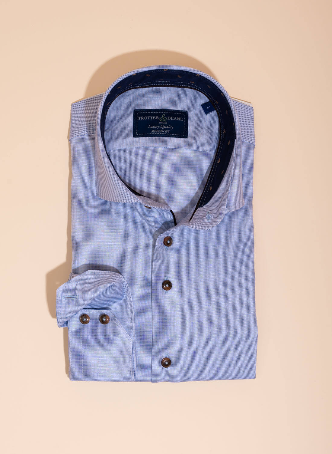 Using only the finest long yard Egyptian cotton, all our shirt fabrics are woven in Italy. Distinct and unique eye-catching trims are a signature of Trotter & Deane and allow our shirts to make a statement when worn open necked. Contrasting stitching and button details draw attention to the quality and add interest to the overall look.